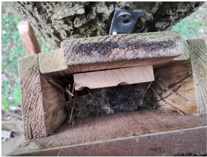 Op 24 maart zijn we (Marijke, Marlies en André) begonnen met alle nestkasten te controleren; In de nestkast hierboven lag al 1 ei! De week erop lagen er 8 en op 7 april lagen er 13 in.Vrouw pimpelmees vloog af! Je ziet alle veertjes in het nest, die gebruikt ze ook om de eieren toe te dekken als ze even weggaat om te foerageren. Gisteren op 14 april vloog ze weer af en de eieren worden dus bebroed! Ze broedt 13-15 dagen, dus wie weet, hebben we volgende leek al hele kleine pimpelmezen! Gisteren telden we al 105 eieren, van een boomklever, een boomkruiper, spreeuwen en heel veel kool-en pimpelmezen!