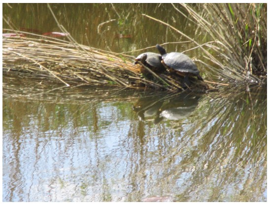 Tijdens het controleren van de spreeuwenkasten zagen we vanaf de ladder deze twee schildpadden; die hebben de winter dus overleefd!